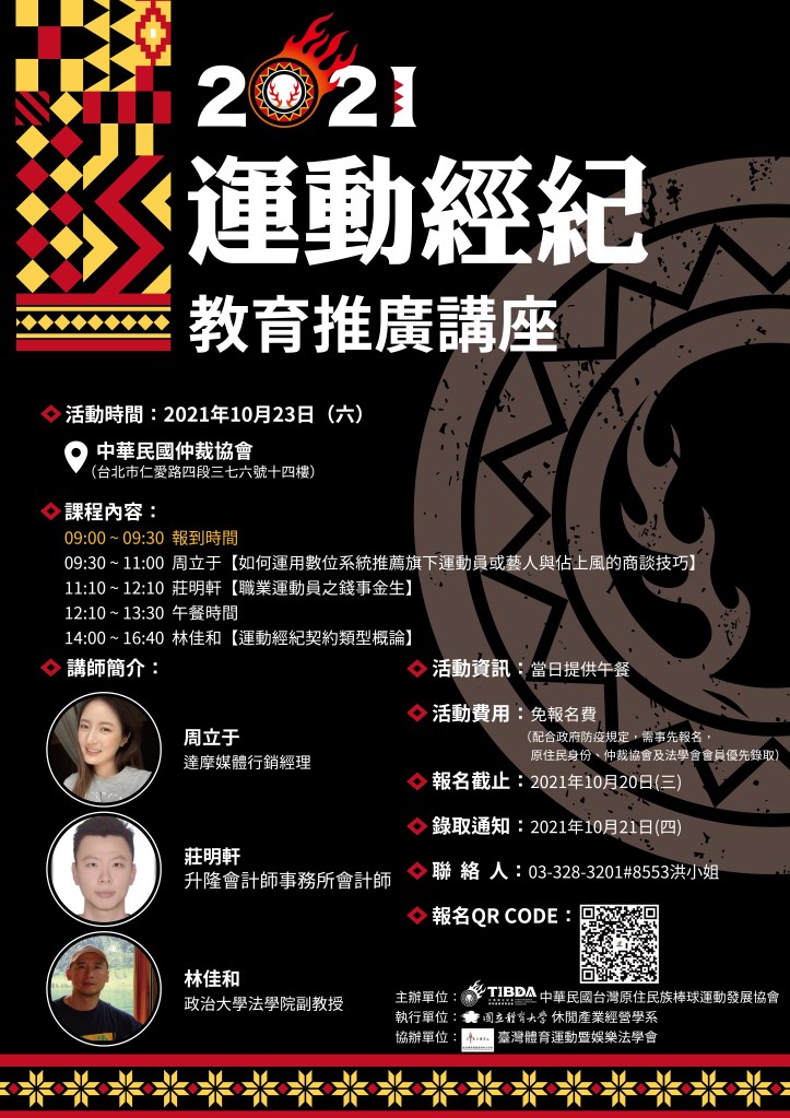由中華民國台灣原住民族棒球運動發展協會主辦的運動經紀教育推廣講座將在2021年10月23日(六)舉行🙌🏻 邀請到達摩媒體周立于行銷經理、升隆會計師事務所莊明軒會計師與政治大學法學院林佳和副教授來和大家分享經驗💡