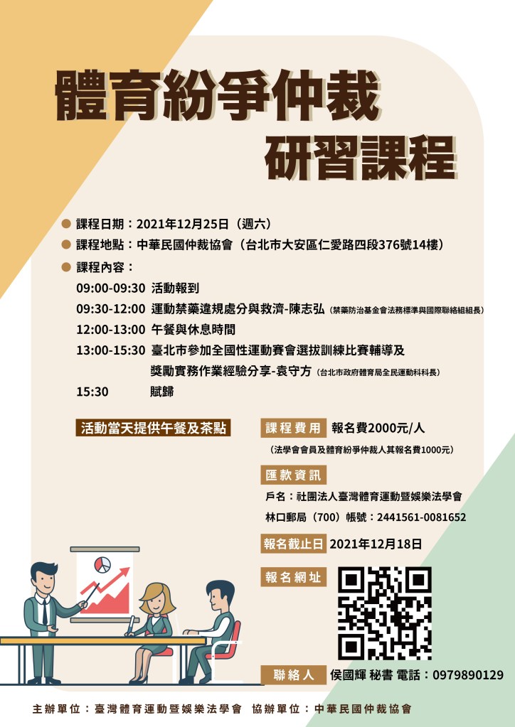 課程費用:報名費2000元/人(法學會會員及體育紛爭仲裁人其報名費1000元)