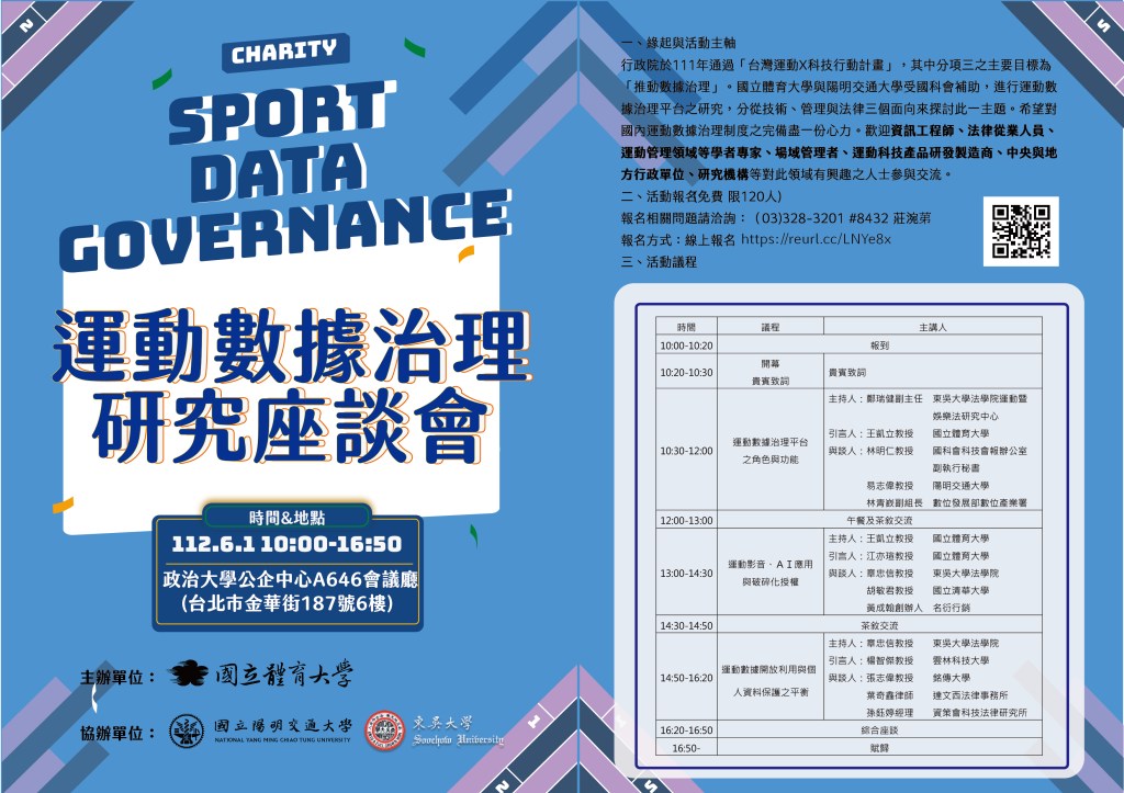 由國立體育大學主辦、陽明交通大學與東吳大學協辦的《運動數據治理研究座談會》,將於2023年6月1日在政治大學公企中心 A646會議廳(北市大安區金華街187號)舉辦。開始報名了,快來手刀搶名額!