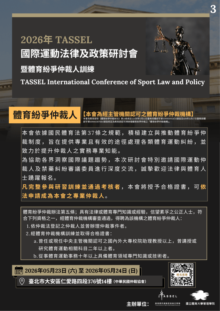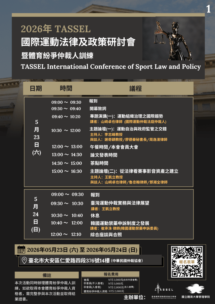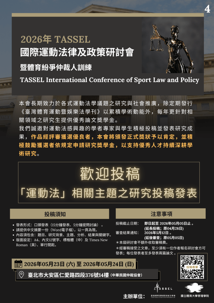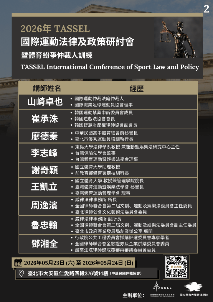 - 主辦單位:社團法人臺灣體育運動暨娛樂法學會、國立體育大學管理學院